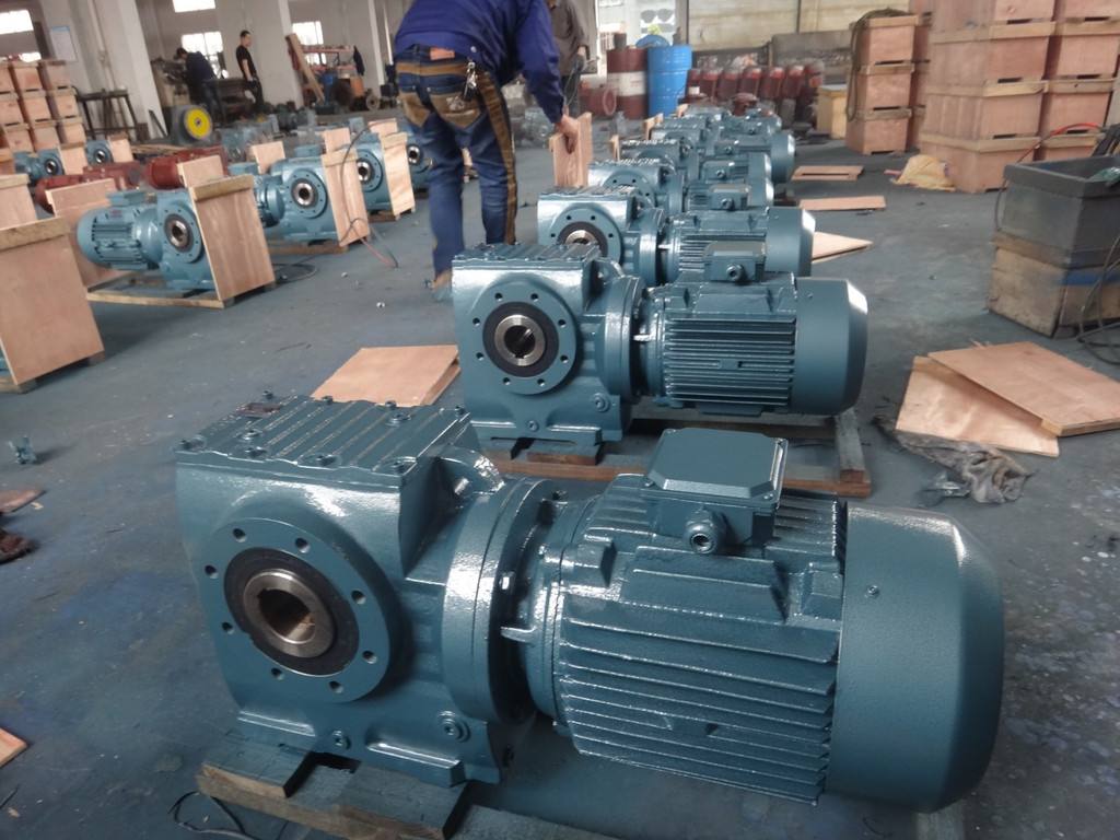 制造和组装大量的细正齿轮是困难且不经济的,因此将它们制成带有齿的整体齿轮,这些齿沿着螺旋方向。 斜齿轮不像正齿轮,因为它们会产生不希望的力。 但是,振动和强度方面的优势远远超过前后推力和制造成本略有增加的劣势。 因此,在蜗轮减速器的制造中,斜齿轮代替了正齿轮。 轴斜齿轮减速机,K系列螺旋锥齿轮减速机,S系列斜齿轮蜗轮减速机,F系列平行轴斜齿轮减速机。