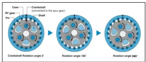 在外壳的内环圈内装有圆柱形的滚针,RV齿轮的偏心运动引起滚针与摆线形RV轮齿的啮合和脱离,产生多组RV轮齿与滚针同时啮合,提高负载能力。由于RV齿数比滚针少1个数目,因此当偏心轴旋转一周时,如果固定外壳(case),则RV齿轮与输入轴同向转1个齿的角度。